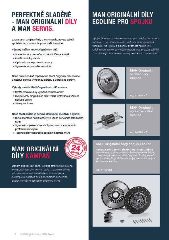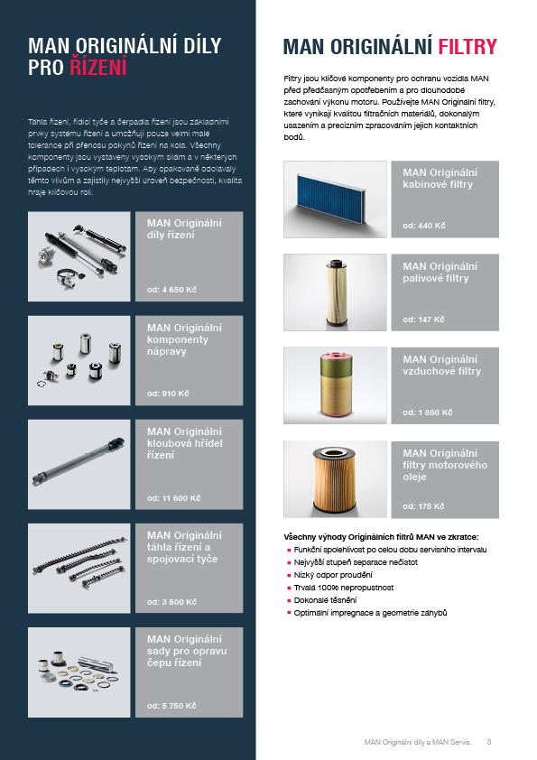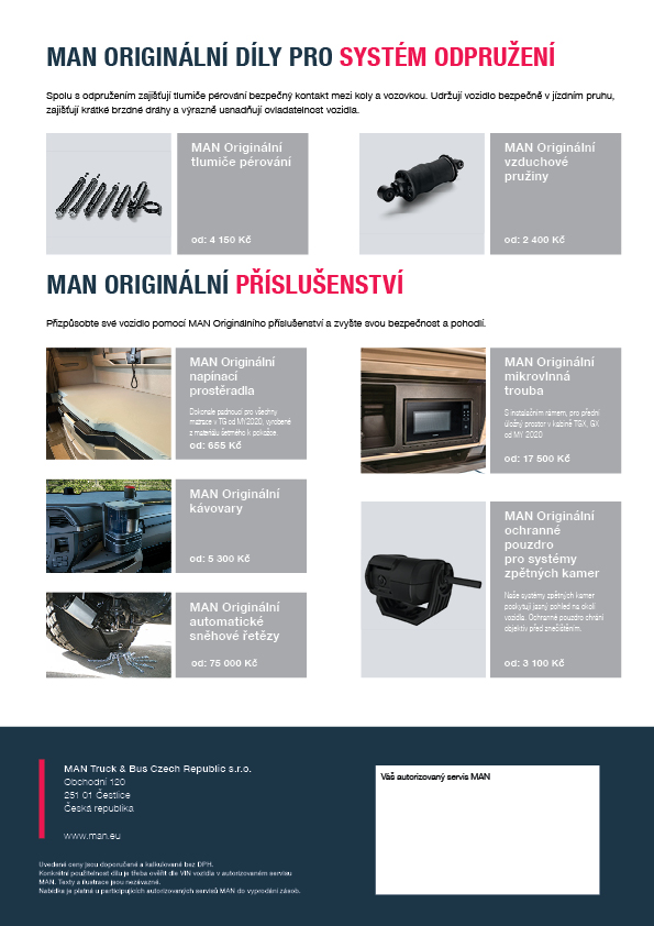 Nabídka platná od 1.8. do 15.10. 2025 MAN vyniká výjimečně vysokou kvalitou a tím zajišťuje maximální životnost Vašeho vozidla. Autorizovaný servis MAN se postará mimo jiné o to, aby byly díly vyměněny rychle a včas bez zbytečných prostojů. Díky tomu si můžete být jisti, že Vaše vozidlo bude vždy připraveno k nasazení po celou dobu jeho životnosti. Originální příslušenství MAN znamenají: ■ spolehlivost a jistotu ■ optimalizace nákladů provozu vozidla ■ vyšší zůstatkovou hodnotu Vašeho vozidla.